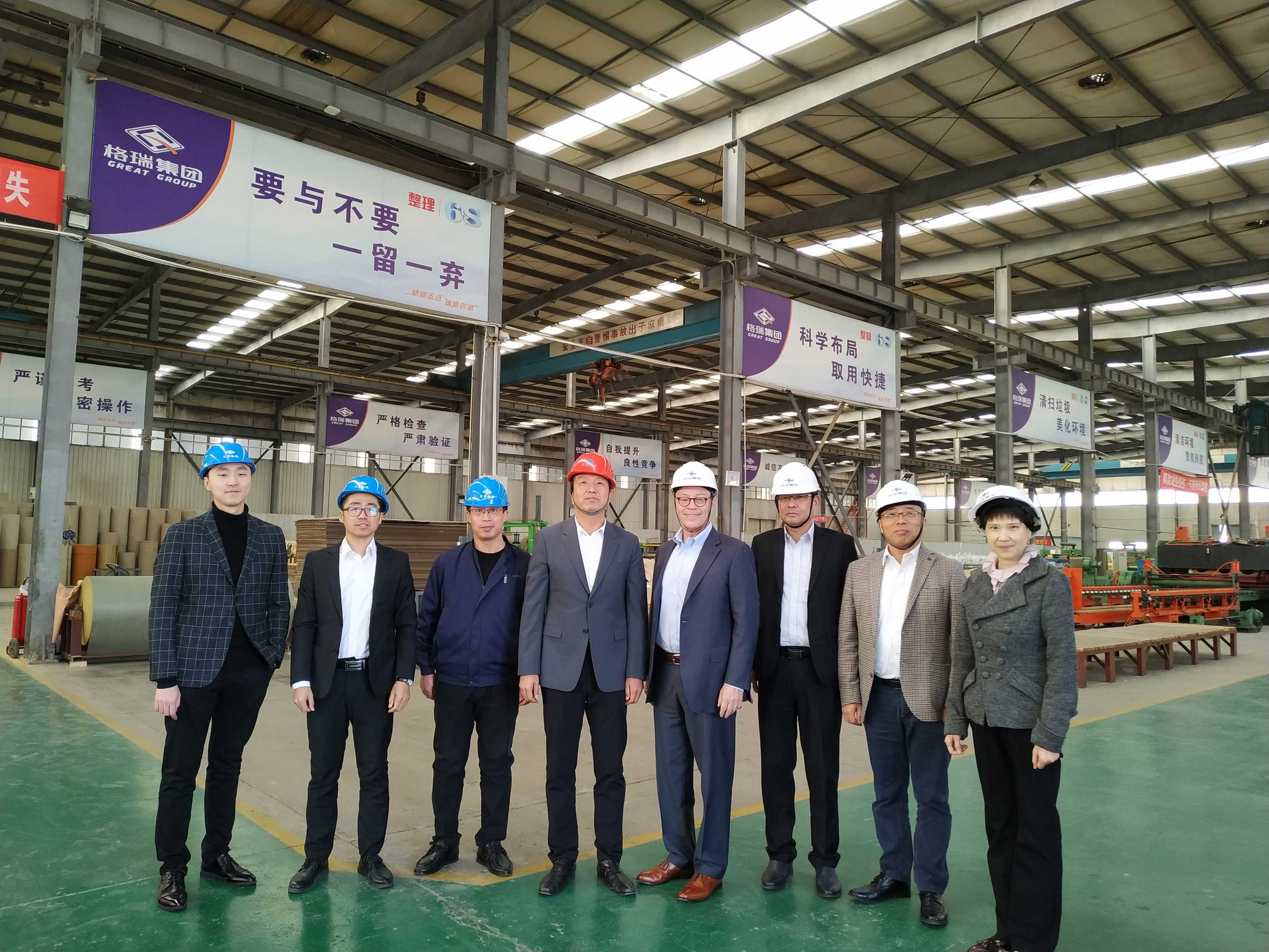 首先一行人參觀了格瑞剪切加工中心及庫房,期間Kevin B. Kramer先生和Vincent Fu先生分別對我司設備情況及庫房倉儲情況進行了了解,二人了解情況后對我司以客戶為導向的“快而精”的運營模式及倉儲量給予了高度贊揚,并表示希望與格瑞集團有更深入的合作。