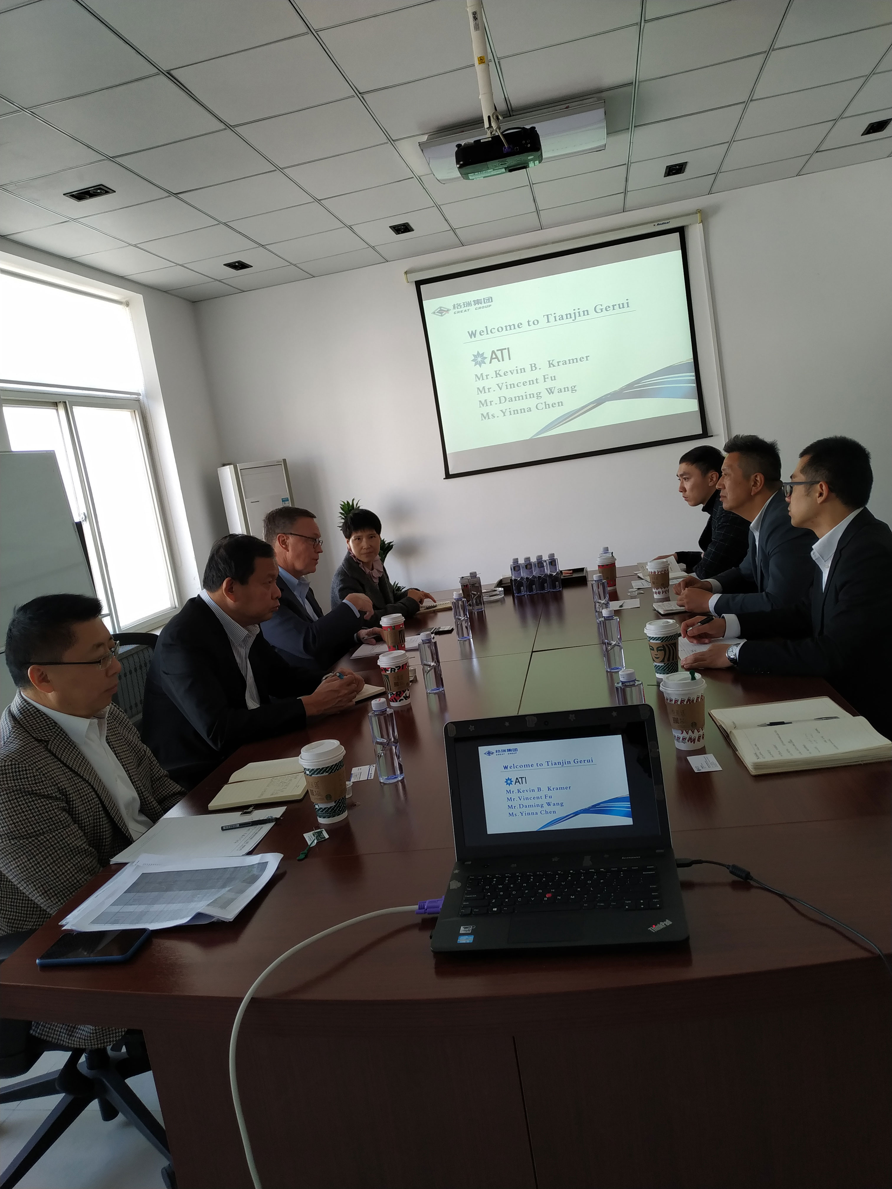 上午9:30許ATI集團副總裁Kevin B. Kramer、ATI亞洲區(qū)總裁Vincent Fu攜同ATI中國區(qū)首席代表王大明及銷售經理陳殷娜一行四人抵達格瑞集團天津總部,格瑞集團總經理龐宏先生熱情接待。